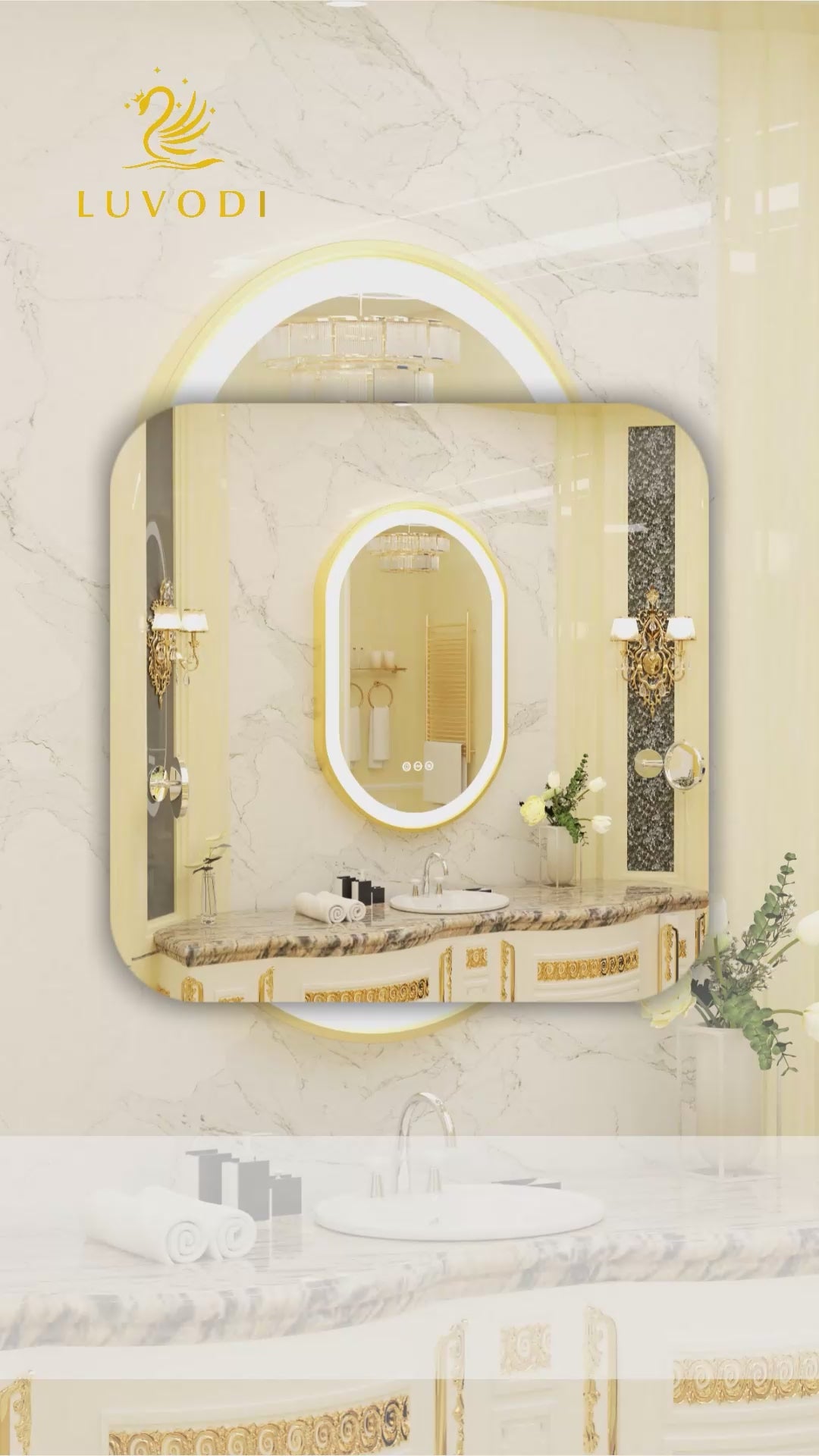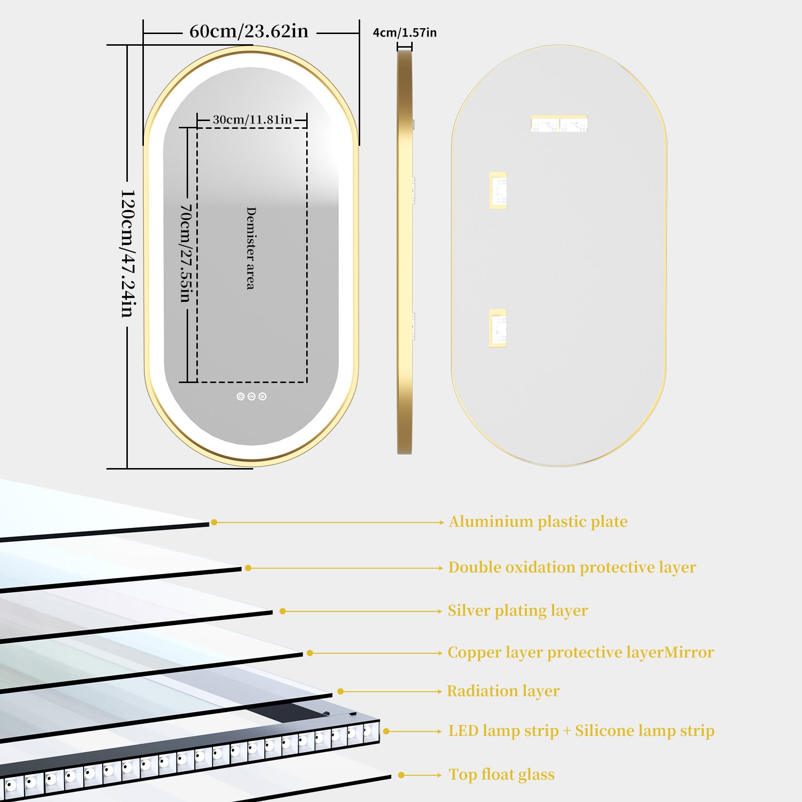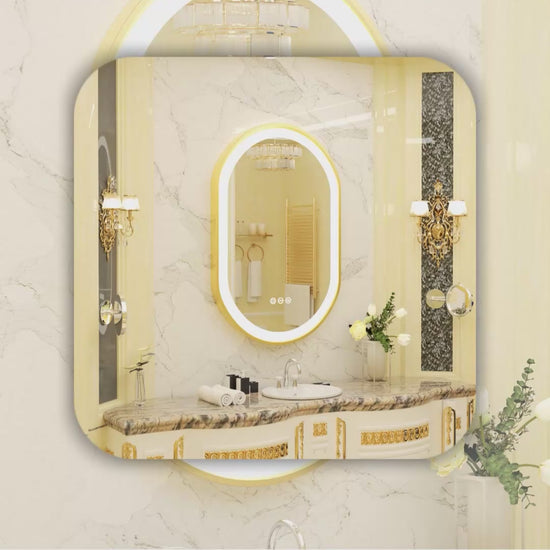 LUVODI Capsule Shape LED Bathroom Mirror with Gold Aluminum Alloy Narrow Frame Defogging 3 Color