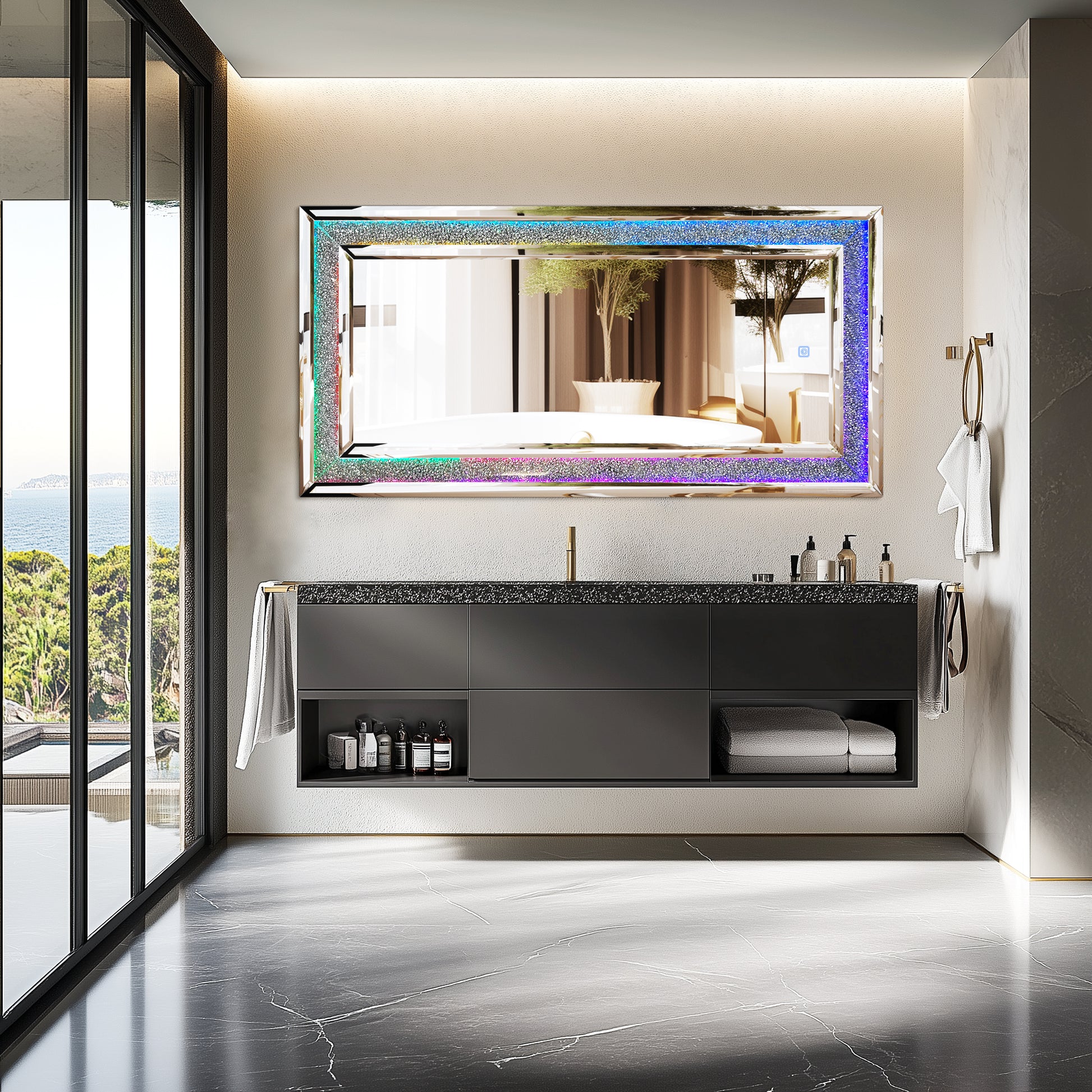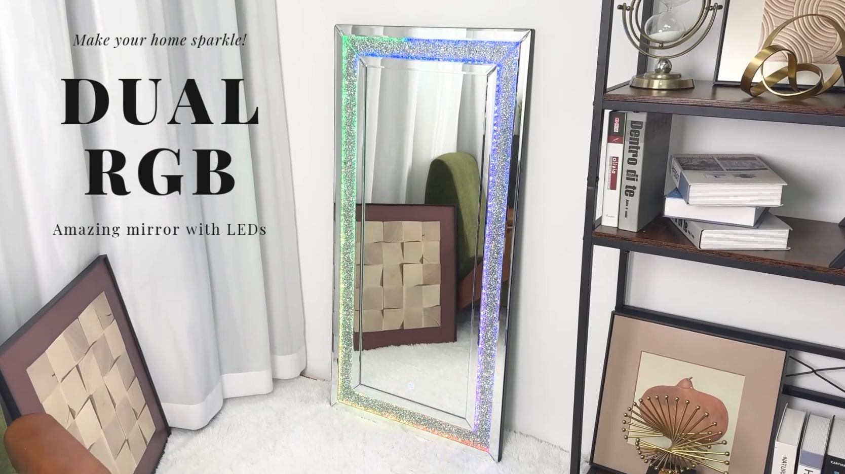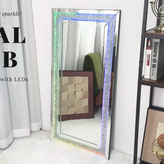 Full Length Mirror with RGB Lights Wall Hanging Mirror Crush Diamond Inlay for Living Room, Bedrooms, Cloakrooms